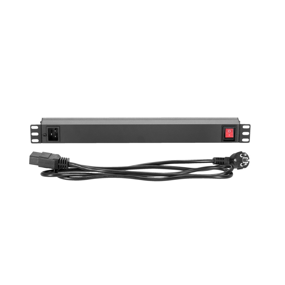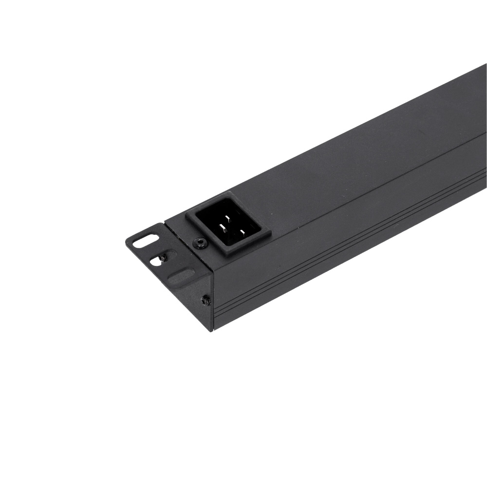 Profesionálna a stabilná 8-cestná zásuvková lišta v 19" formáte s 1 U. Perfektne sa hodí pre inštaláciu do racku a s tým spojený rozvod napájania zariadení. Pre maximálny prúd 16 A v spojení s IEC káblom je tu pripojenie IEC C20 , ktorý je tu inštalovaný Sieťový kábel s IEC C19 na uhlové pripojenie Schuko a dĺžkou 2 m je vpredu zapínaný/vypínaný a zásuvky vzadu sú otočné o 45°.