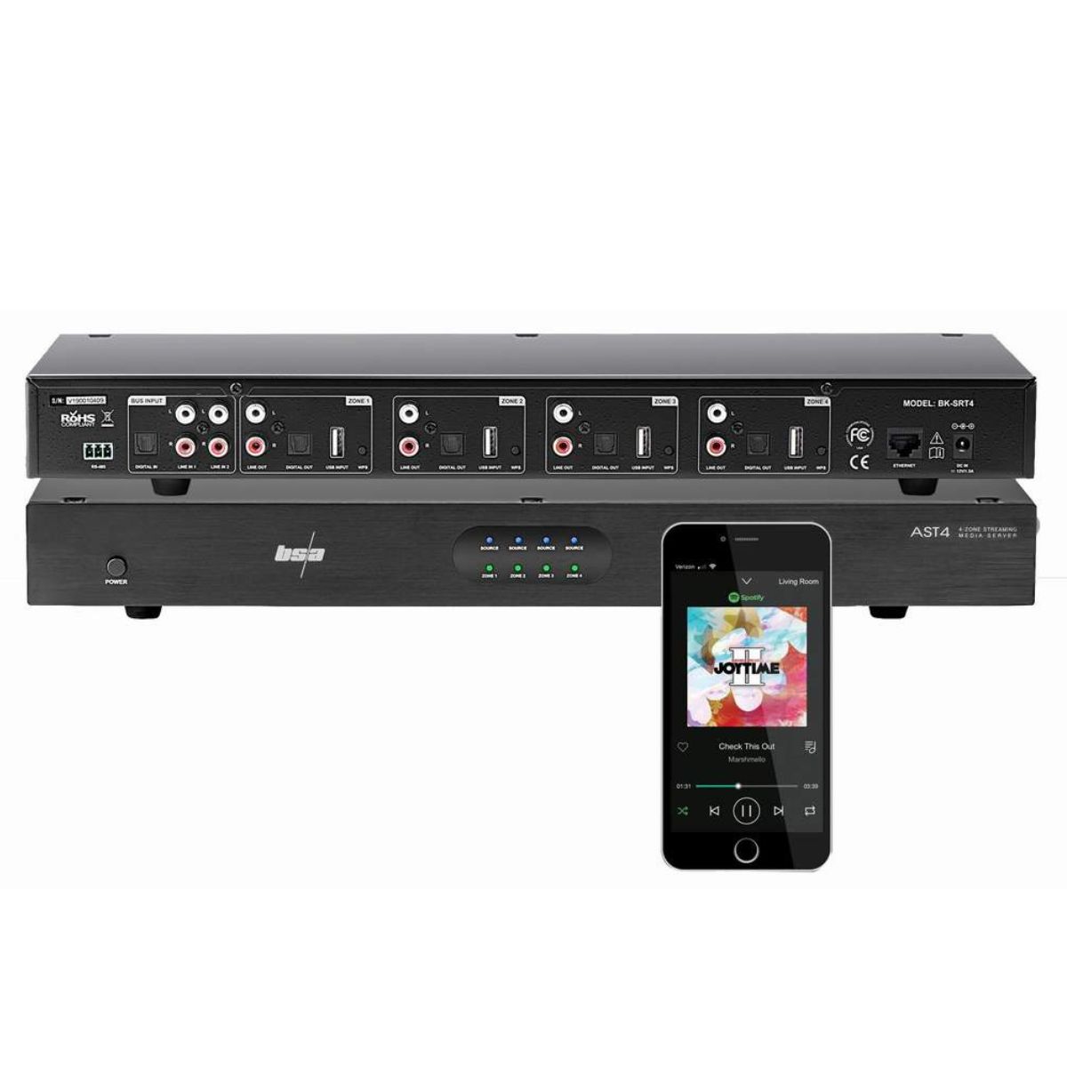 AST4 je 4-zónový sieťový prehrávač (streamer) umožňujúci prehrávať internetové rádia, podcasty a hudobné súbory z lokálneho alebo sieťového (NAS) úložiska do existujúcej audio zostavy. Každá zóna obsahuje aj samostatný USB/MP3 prehrávač, má stereo linkový výstup (2x RCA) a digitálny optický výstup (Toslink). Zariadenie obsahuje aj 1x stereo AUX vstup (2x RCA), 1x stereo Linkový vstup (2x RCA) a 1x digitálny optický vstup (Toslink). Ovláda sa pomocou aplikácie AUDIOCAST alebo SMART SONIX, atď.., ktorú si zdarma možete stiahnuť v príslušnom internetovom obchode.