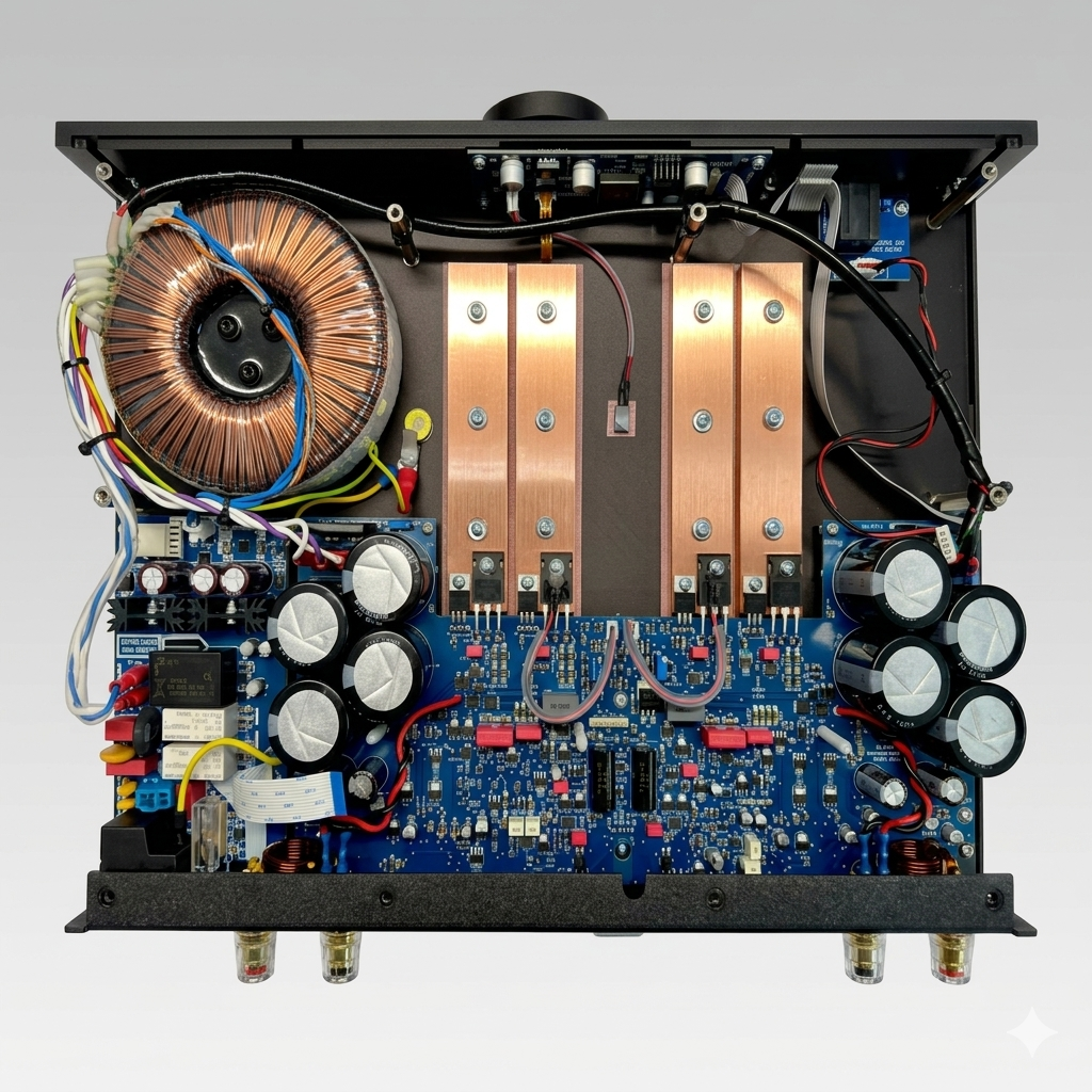 Navigace v menu přináší novou úroveň pohodlí, přičemž interakce se zesilovačem zůstává uživatelsky přívětivá a jednoduchá.Sofistikovaná architektura chlazení kombinuje masivní měděné prvky tepelně spojené s výstupními tranzistory a masivní hliníkový vrchní kryt. Inteligentně řízený ventilátor udržuje stabilní teploty zesilovače a jeho tichý chod.
