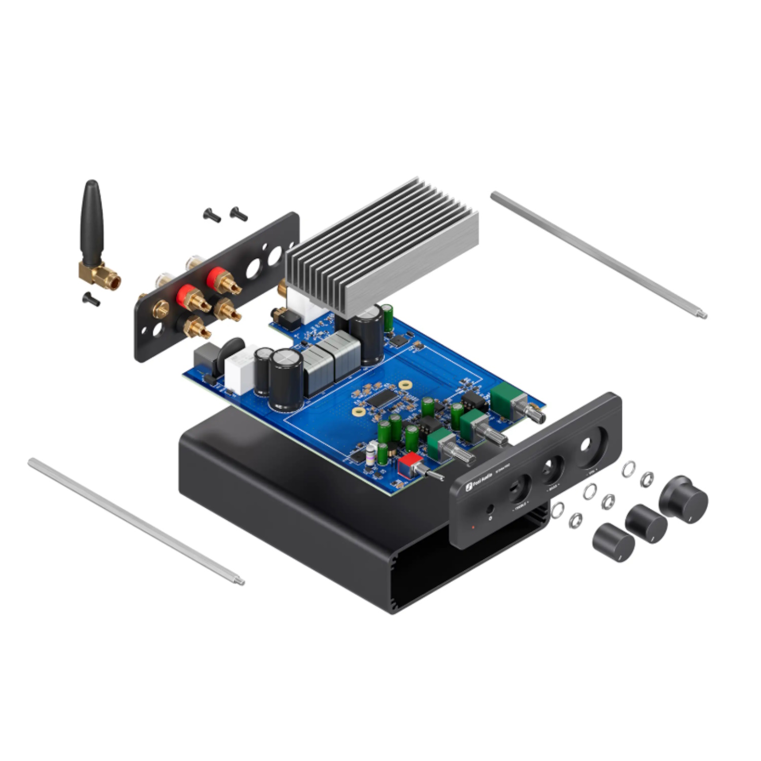 Výrobce uvádí maximální krátkodobý výkon ve špičce až 300 W na kanál. Na předním panelu najdete kromě ovládání hlasitosti také dvoupásmový ekvalizér s korekcemi pro pásma výšek a basů. Srdcem zařízení je TPA3255 čip od společnosti Texas Instruments. Harmonické zkreslení dosahuje hodnot THD: ≤ 0.005%, frekvenční rozsah zesilovače je 20 Hz – 20 kHz.