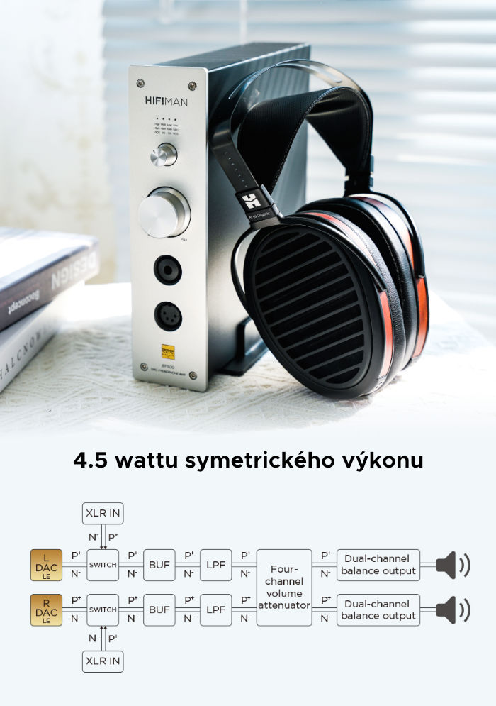 EF500 se pyšní oceňovaným HIMALAYA R2R převodníkem ve verzi LE, který přináší přesnost a linearitu R2R konstrukce s nízkým harmonickým zkreslením jen 0.0025%. Pro sluchátkové nadšence je na palubě zesilovač třídy A/B, který zajistí výkon na úrovni až 4.5 wattu na kanál při 32 ohmech v symetrickém zapojení. Do EF500 tak můžete zapojit téměř jakákoli sluchátka a nemusíte se bát o výkonovou rezervu. Podstatné je, že budou znít tak dobře, jako nikdy předtím.