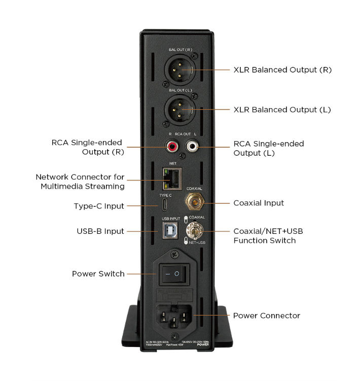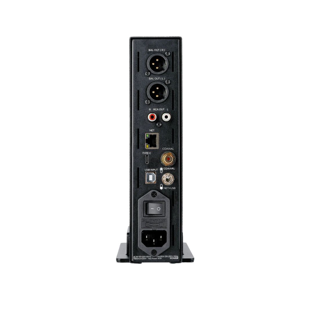 Vstupy: 1 x digitální koaxiální, 1 x USB-C, 1 x USB-B, 1 x ethernet RJ45