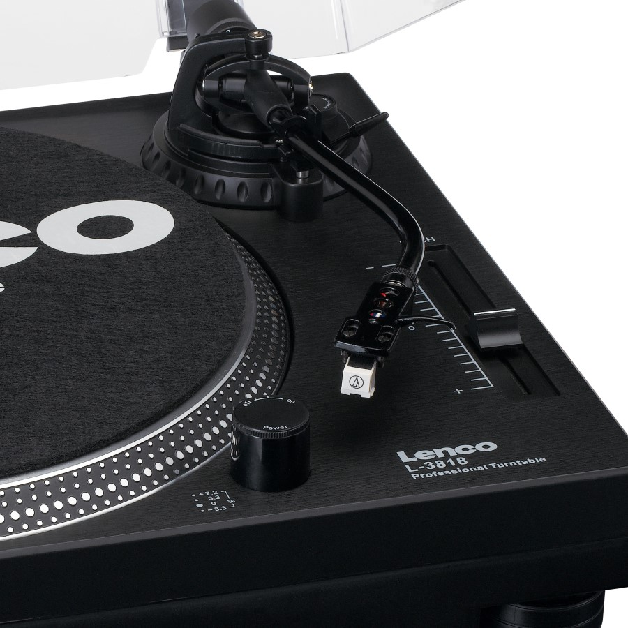 Lenco L-3818BK je kvalitní, profesionální gramofon s přímým pohonem, který je vhodný pro DJ i běžný poslech hudby. Talíř gramofonu je vybaven osvětlením a stroboskopem. Snadno upravíte rychlost pomocí jemné regulace otáček. Lenco L-3818 můžete připojit přímo ke stereo zesilovači, mixážnímu pultu nebo aktivním HiFi reproduktorům. Vestavěný předzesilovač lze vypnout a použít jiný externí.