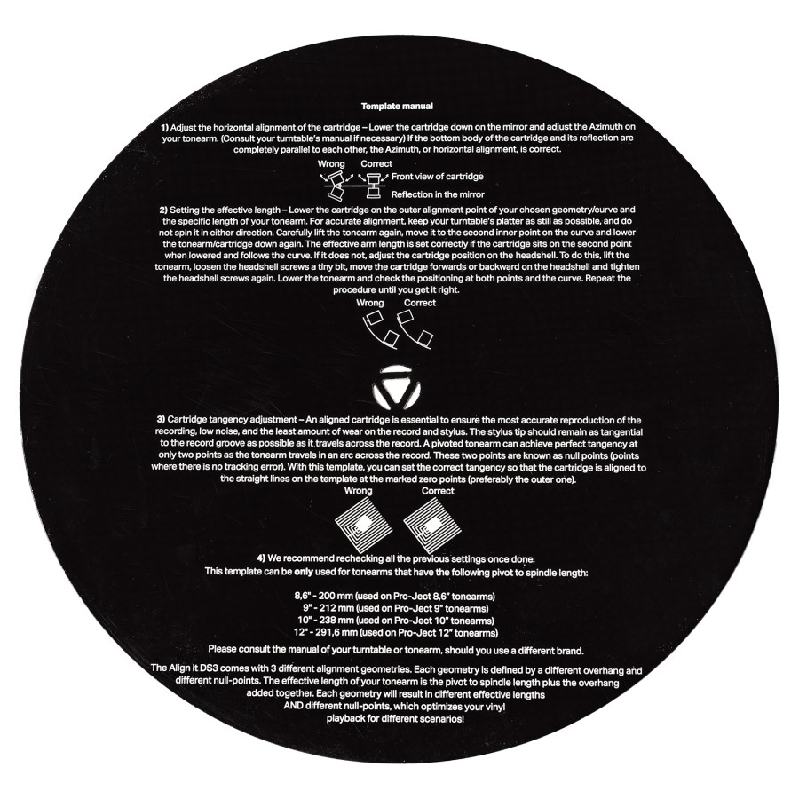 Šablona Align it DS3 je vhodná pro všechny gramofony Pro-Ject a většinu gramofonů a ramen jiných výrobců v závislosti na vzdálenosti od čepu k ose.