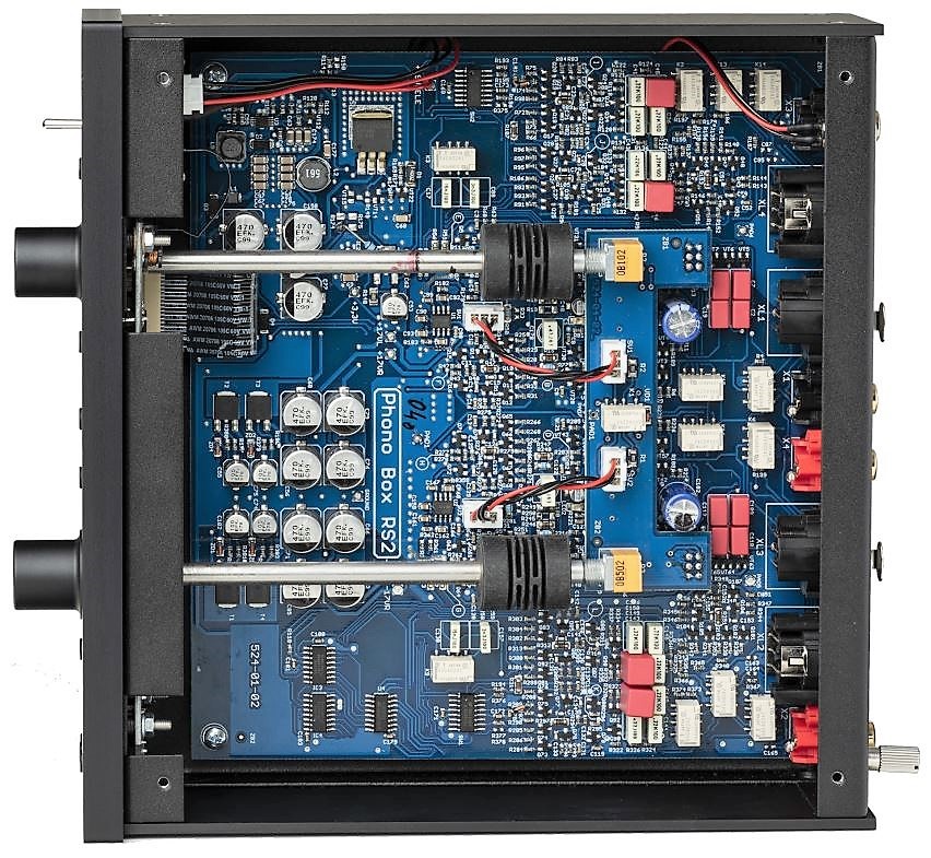 Phono Box RS2 je špičkový phono předzesilovač nejvyšší třídy. Od vstupu k výstupu je 100 % symetrický. Elektronika je plně diskrétní, nepoužívají se žádné operační zesilovače a využívá dělené pasivní RIAA a DECA ekvalizace. S ekvalizací musí být zacházeno a implementováno velmi opatrně a pasivní dělení je nejdražší, ale také jediný způsob, jak dosáhnout ten nejpřesnější zvuk.