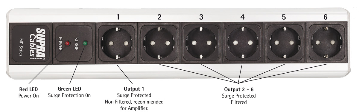- MD06EU/SP je chráněn proti přetížení 10A jističem, interní pasívní filtr byl pro Supru vyroben anglickou firmou Ben Duncan Research. Celek má elegantní profilované tělo z litého hliníku. Jako přívodní kabel je doporučen stíněný model Supra LoRad 3x2,5mm (nestíněný přívod do filtru by celý, jinak pozitivní efekt, částečně snížil). Filtr je chráněn proti přetížení pojistkou a lze na něj zapojit audio-video spotřebiče o příkonu až 3500 Watt. Obsahuje rovněž ochranu proti nepřímému úderu blesku a celé tělo má stínící účinnost 100%.