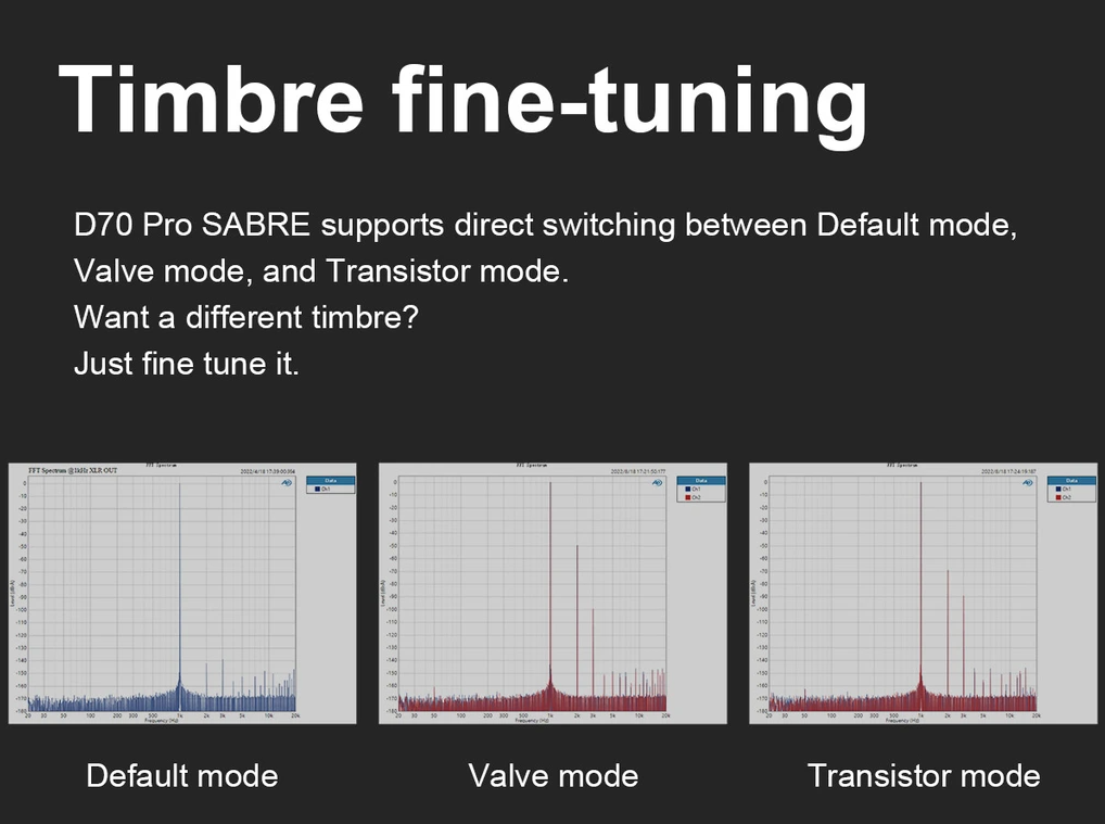 Převodník umožňuje snadno přepínat mezi třemi charaktery zvuku. K dispozici je režim Základní, Elektronka a Tranzistor. Snadno tak můžete jemně doladit zvuk podle svých preferencí.