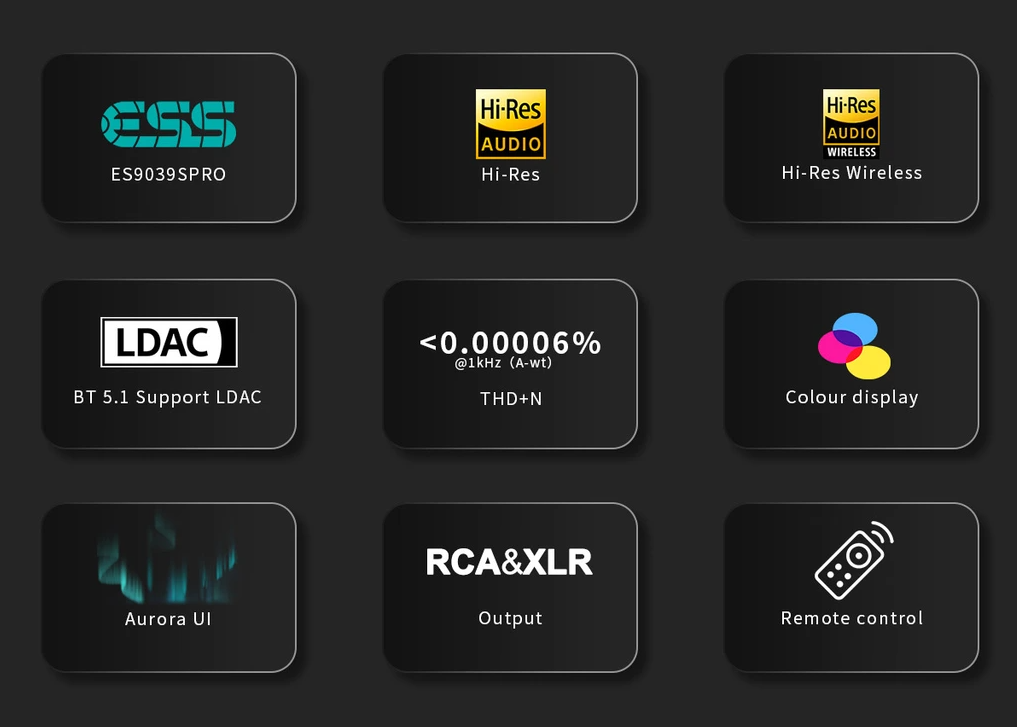 Symetrický stolní D/A převodník s nejnovějším čipem ESS SABRE ES9039SPRO. Podporuje WIN, MAC, Linux, iOS, Android. Bluetooth 5.1 příjem s kodekem LDAC i aptX HD, vestavěný předzesilovač s ovládáním hlasitosti, dálkové ovládání. Výstupy XLR i RCA. Barevný displej s dotykovými tlačítky.
