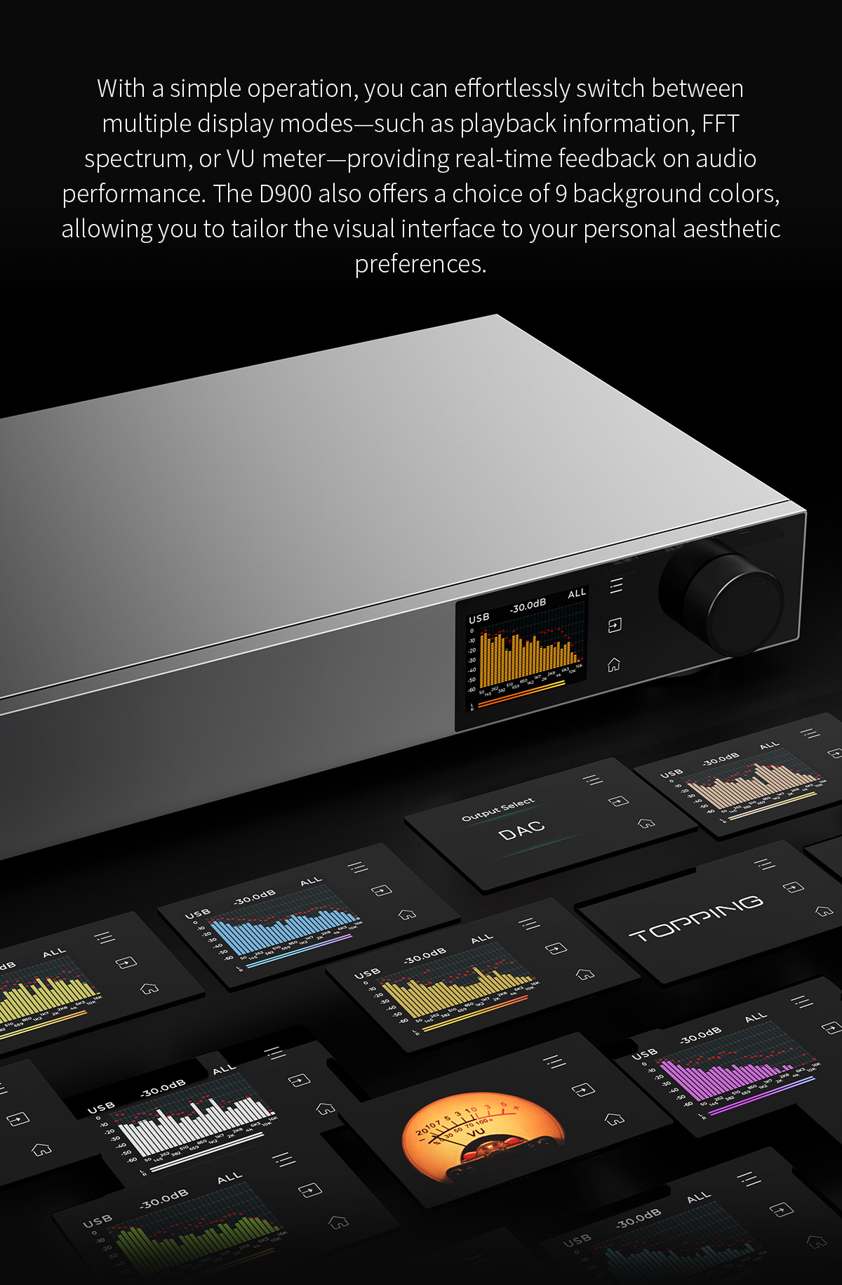 Používateľ si môže zvoliť medzi rôznymi režimami zobrazenia – informácie o prehrávaní, FFT spektrum alebo VU meter – a vybrať si z 9 farebných pozadí podľa svojho vkusu.