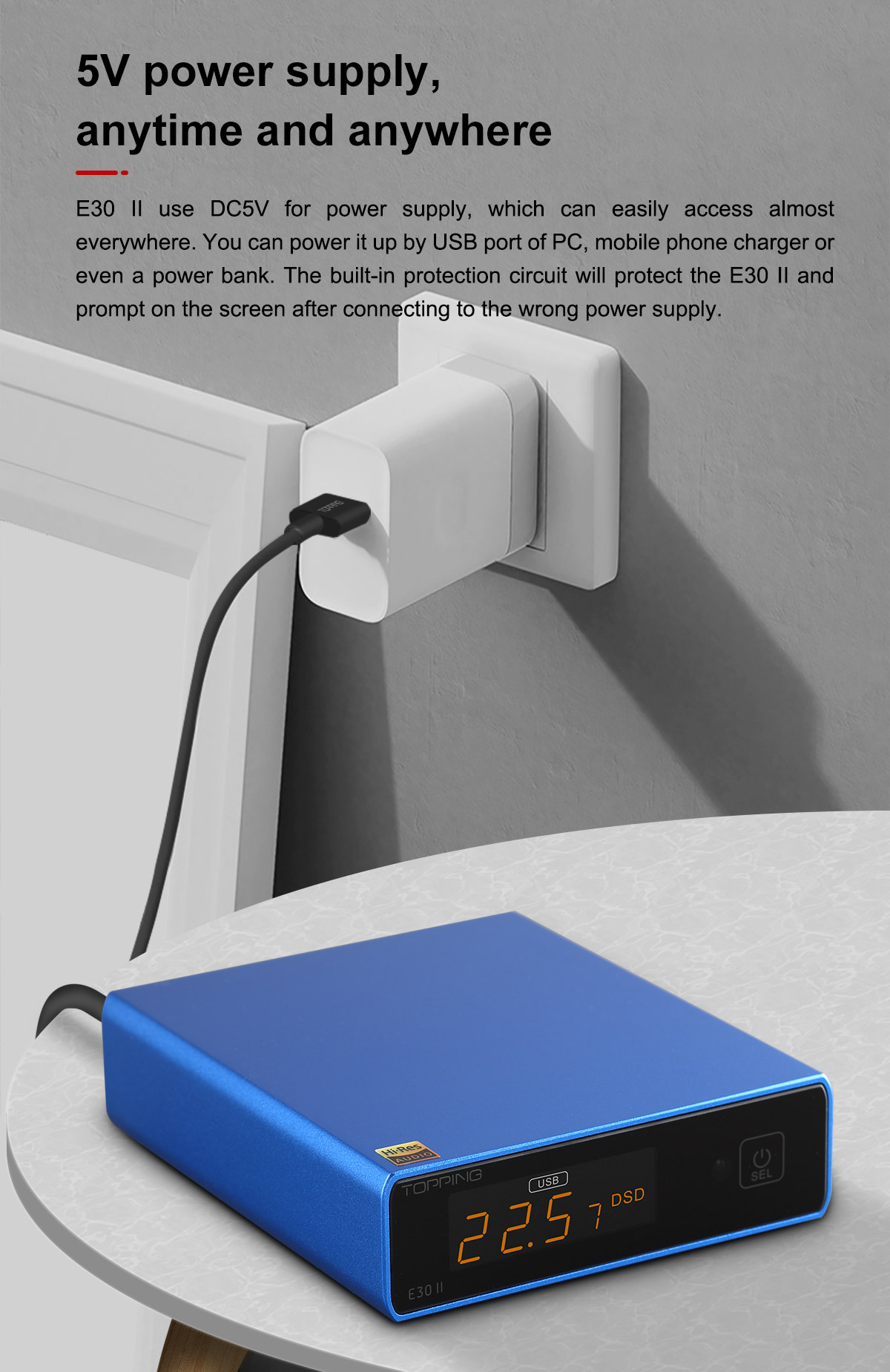 Podporované rozlišení PCM 768 kHz/32 bit a DSD 512. Vstupy: USB, optika, coax. Dálkové ovládání v balení. Napájení samostatným USB. Vestavěný předzesilovač s nastavením hlasitosti.